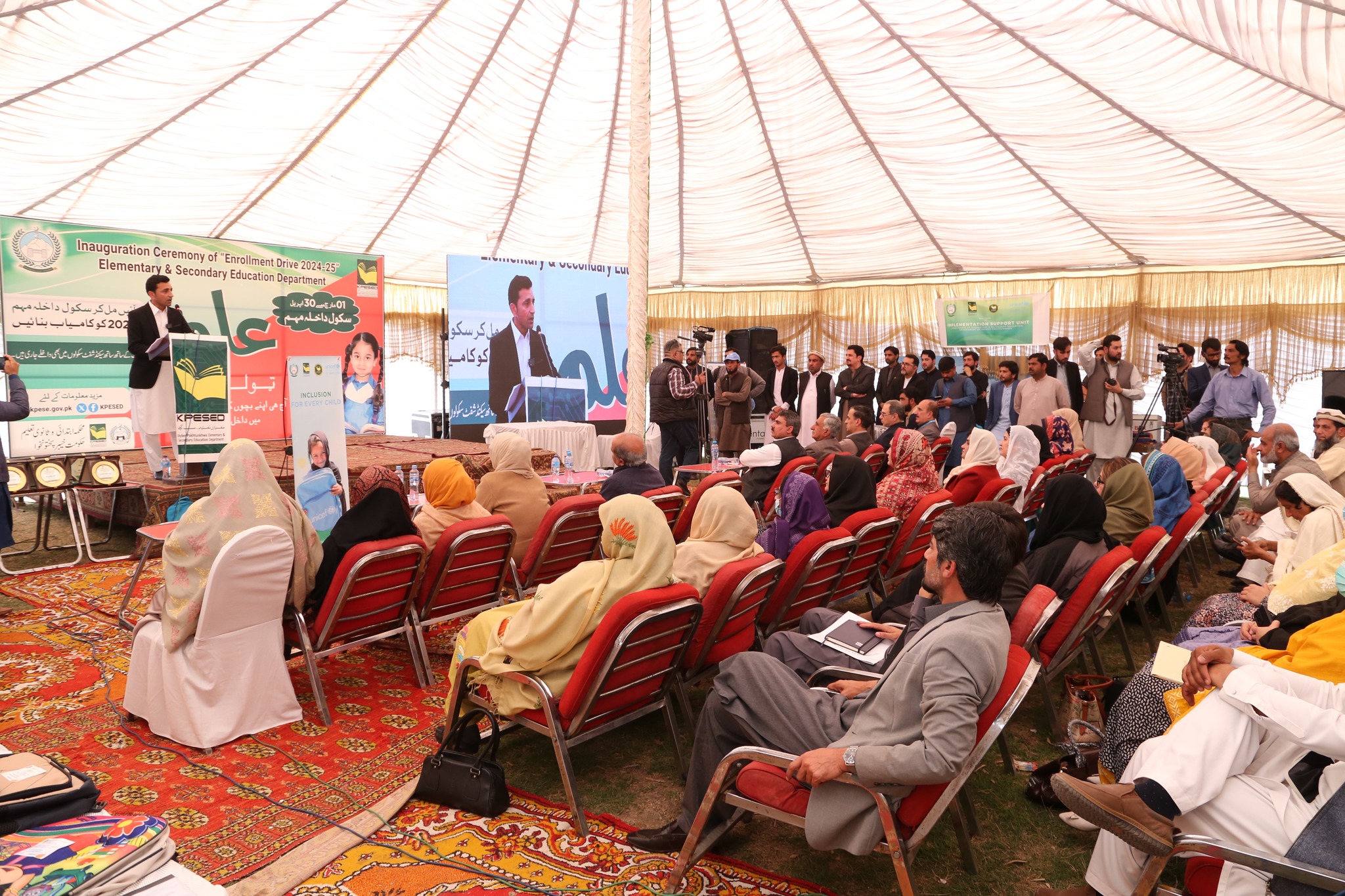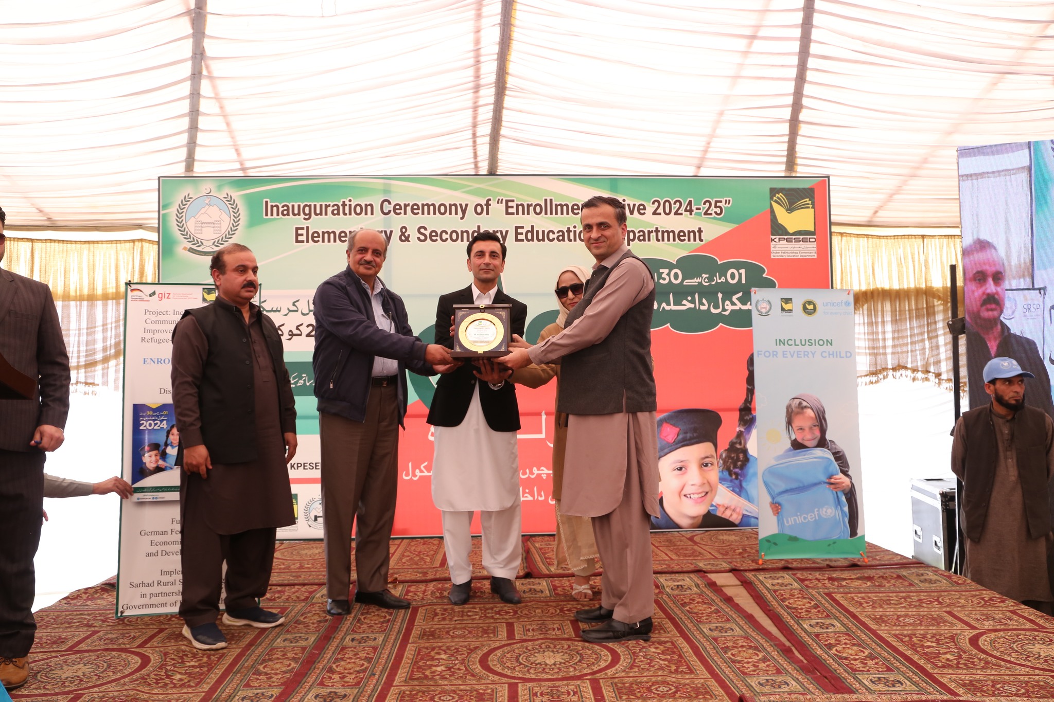 The honorable Minister E&SE KP, Mr Faisal Khan Tarakai, inaugurated the enrollment campaign by registering the names of out-of-school children. #SRSP, with financial support from GIZ-Pakistan, provided logistical support for the inauguration of the Mega Provincial “Enrollment Drive 2024-25”. Additionally, SRSP installed a stall, showcasing education-focused interventions in KPK. Shields were distributed during the ceremony to acknowledge the contributions of the Education Department and partners in ensuring quality education. SRSP was also honored with a shield for its active role in ensuring inclusive service delivery in education in KP. Later, the Minister E&SE and Secretary E&SED planted saplings to start the Spring Plantation Campaign. Representatives from the Elementary & Secondary Education Department KP, #UNICEF, #GIZ #EHS, #SRSP, teachers, and students participated in the event.
